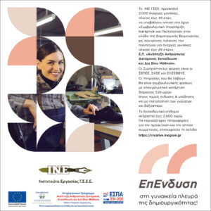 Το Ινστιτούτο Εργασίας της ΓΣΕΕ προσκαλεί άνεργες γυναίκες ηλικίας έως 49 ετών να συμμετέχουν στο Πρόγραμμα «Συμβουλευτική Υποστήριξη, Κατάρτιση και Πιστοποίηση στον κλάδο της Δημιουργικής Βιομηχανίας ως σύγχρονος πυλώνας του πολιτισμού για άνεργες γυναίκες ηλικίας έως 49 ετών», του Ε.Π. «Ανάπτυξη Ανθρώπινου Δυναμικού, Εκπαίδευση και Δια Βίου Μάθηση».